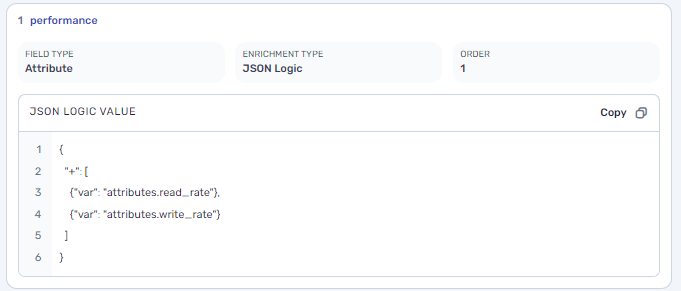 Let’s continue with the example used while creating an event schema. Here, we need to compute the performance value which is dependent on the read and write rates. Let’s take the case where read_rate and write_rate should be added together to determine the total GBps for performance billing. In this case, since both the variables in the computation are part of the schema, we do not have to define a separate dependency. We can directly define an attribute enrichment that adds the read and write rates from the schema.