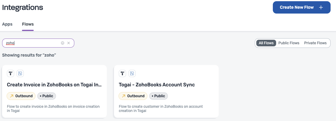 - Inbound Flow - based on third party events(eg: ZohoBooks), actions are triggered in Togai