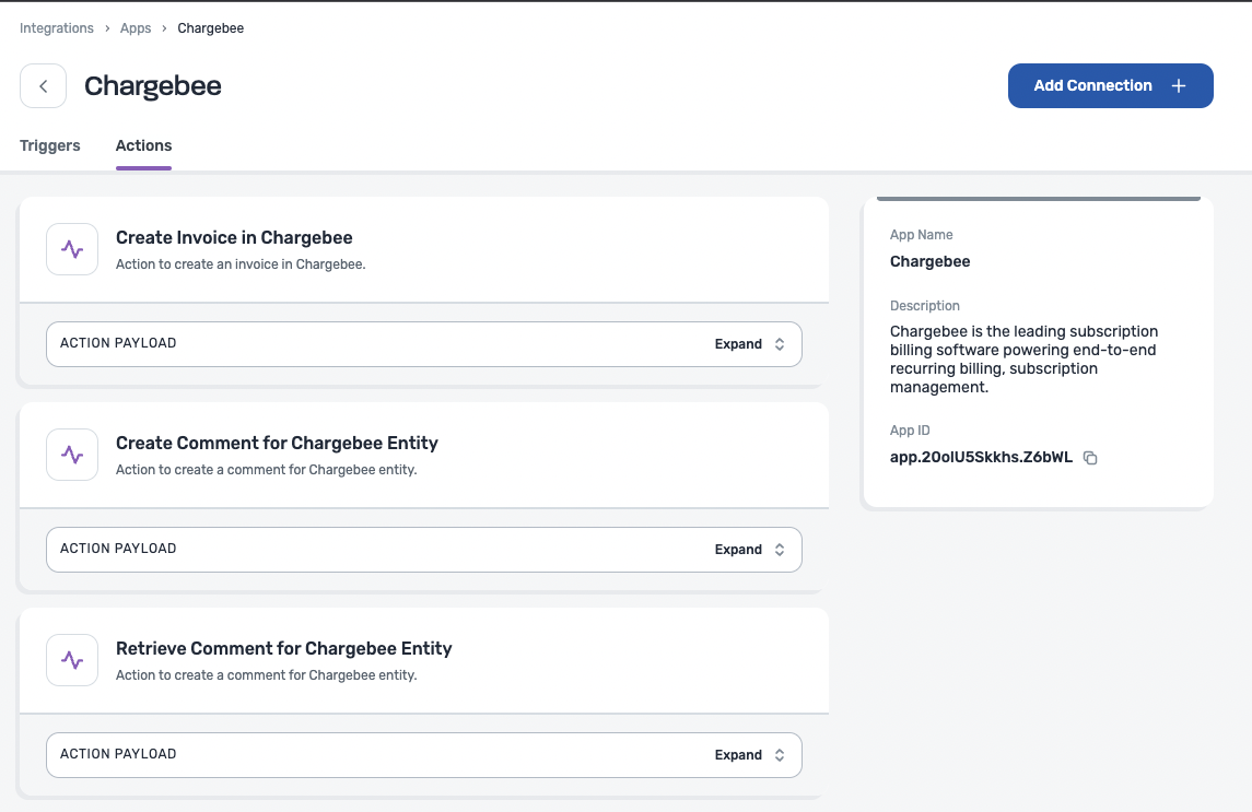 There are 3 Actions and 2 Triggers available for Chargebee currently. The way it works is, When
