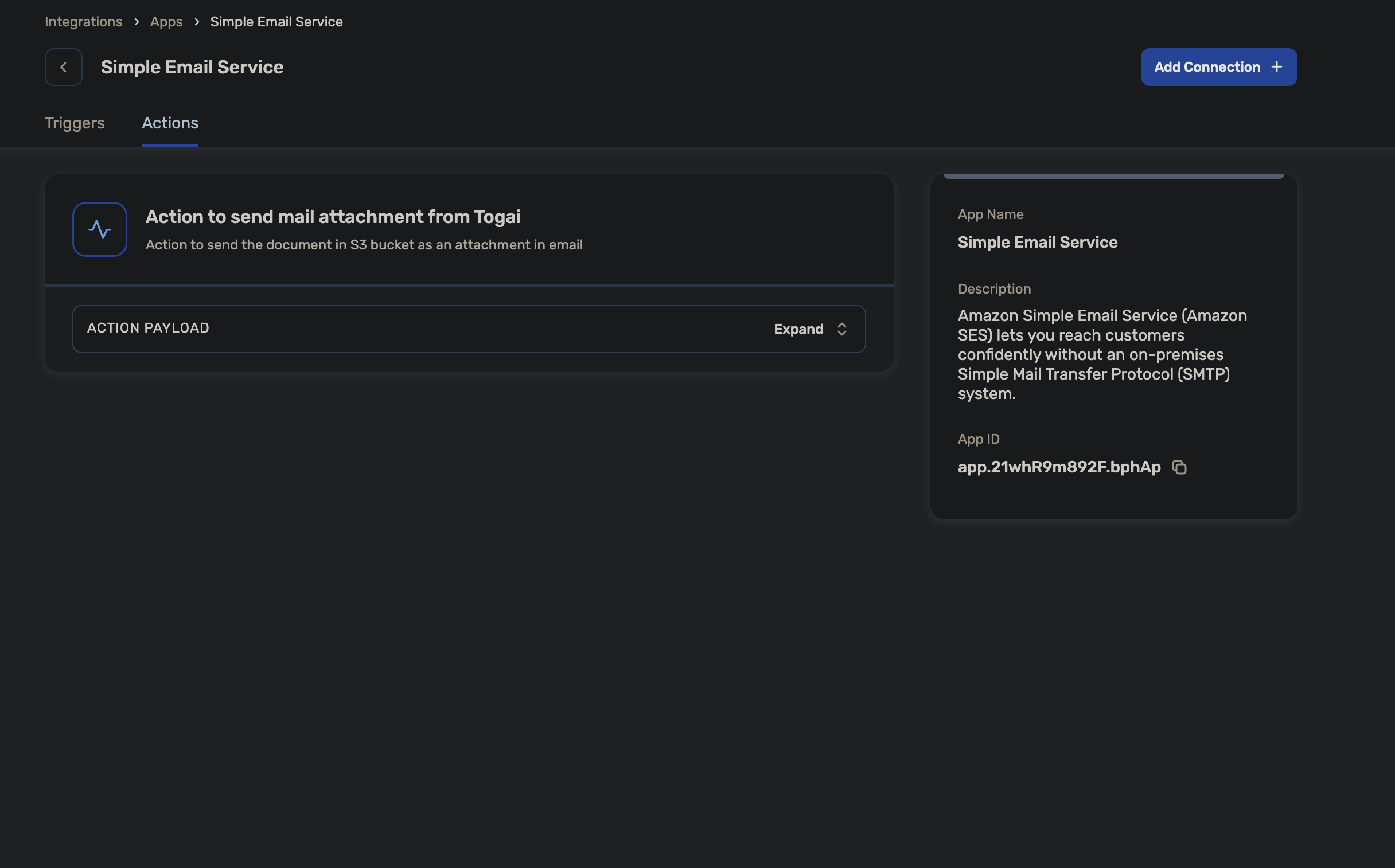 +Add Connection - Configure the triggers and actions by specifying the app instance (SES or Togai) associated with each step.