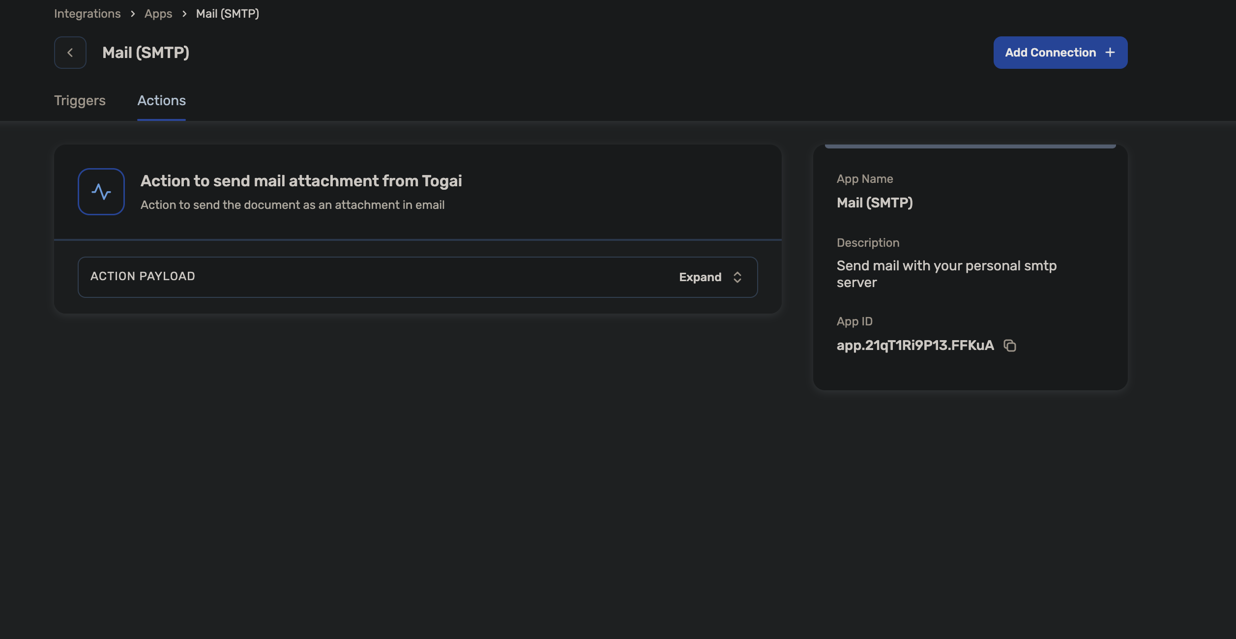 +Add Connection - Configure the triggers and actions by specifying the app instance (SMTP or Togai) associated with each step.