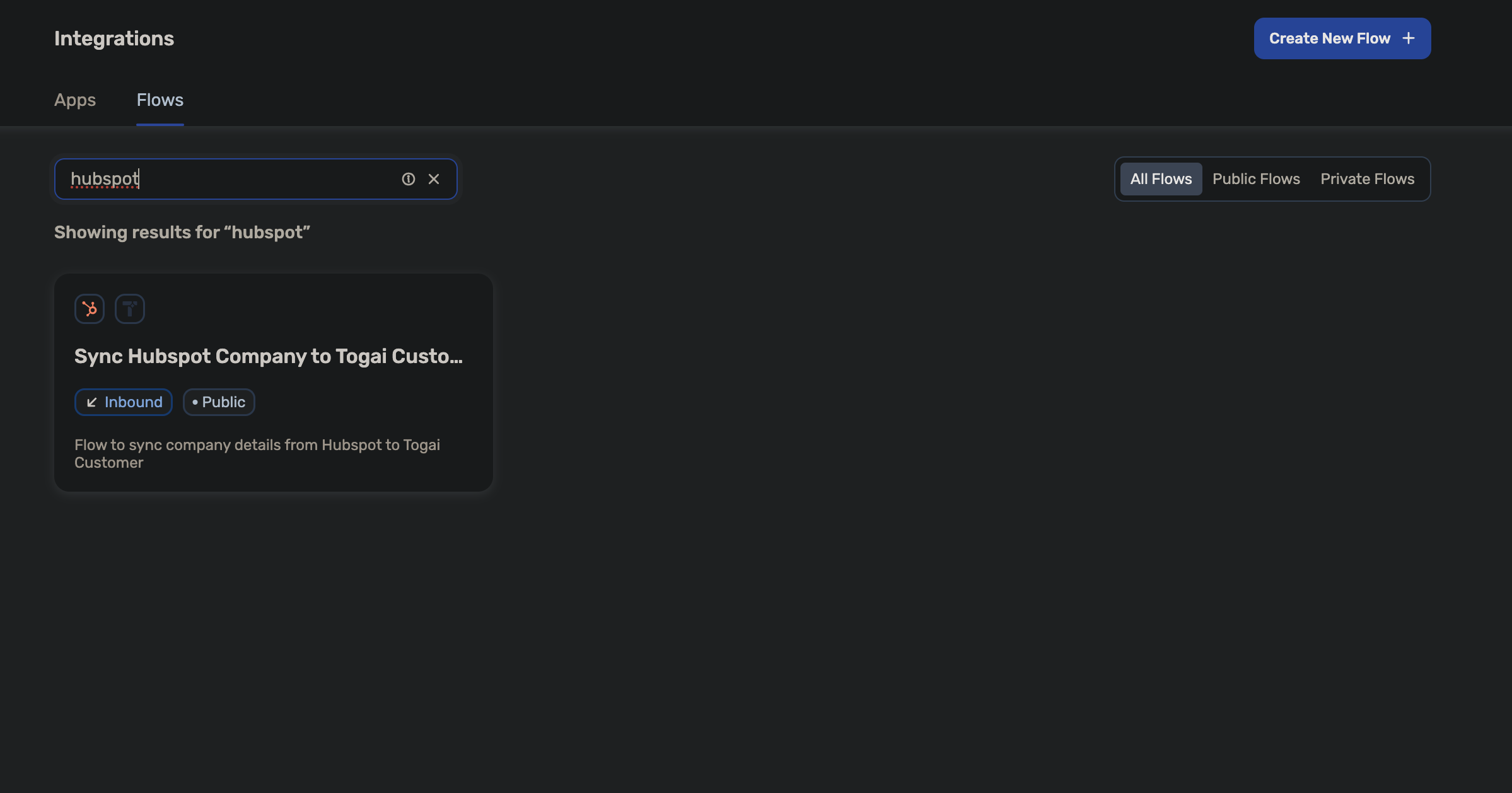 Inbound Flow - based on third party events(eg: Hubspot), actions are triggered in Togai