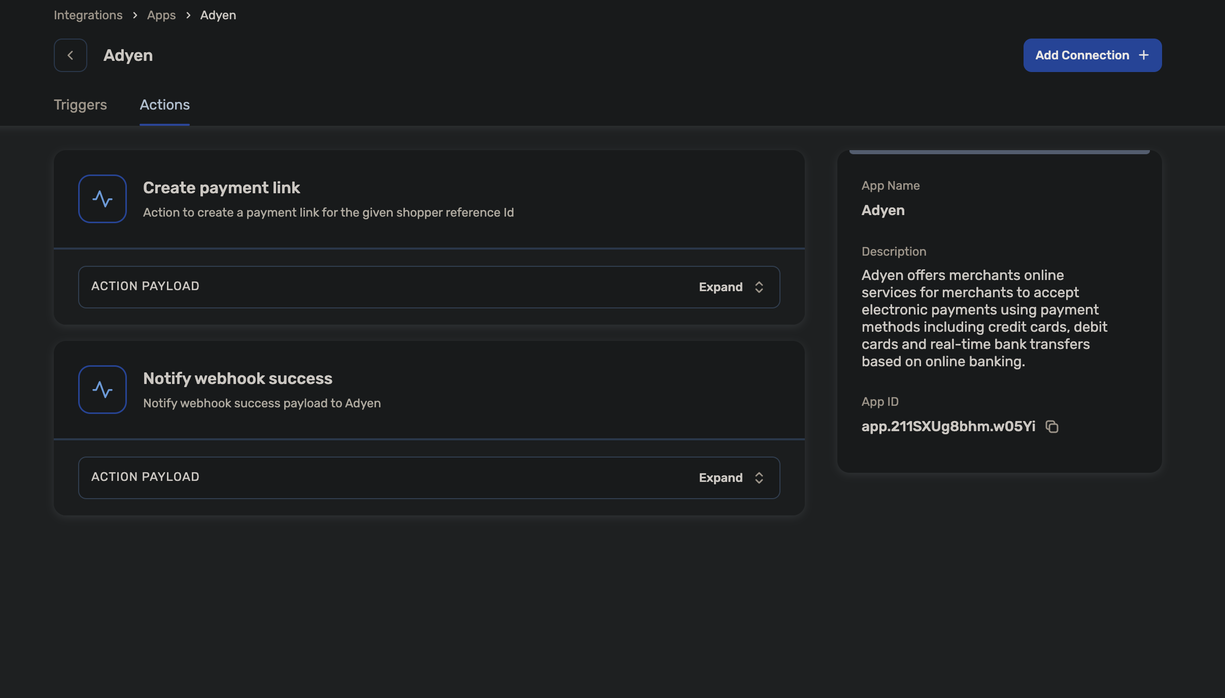 There are 2 Actions and 1 Triggers available for Adyen currently. The way it works is, If