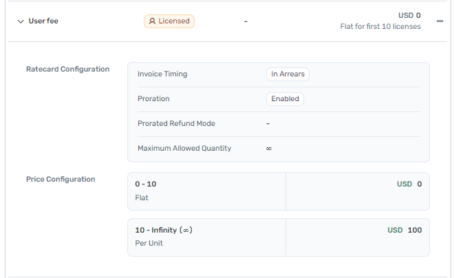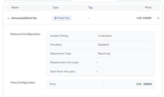 Fixed fee rate cards are used to model a flat pricing that does not have any input quantity. You can model one-time purchases such as setup fees and professional services or recurring fees such as platform subscription fees and bill your customers.