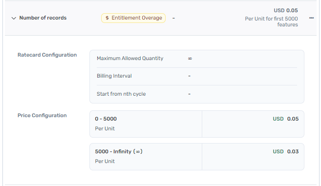 You can have only 1 rate card per billable item in a price plan. You cannot create 2 or more rate cards for the same billable item (usage meter/add-on/feature) within a single price plan.